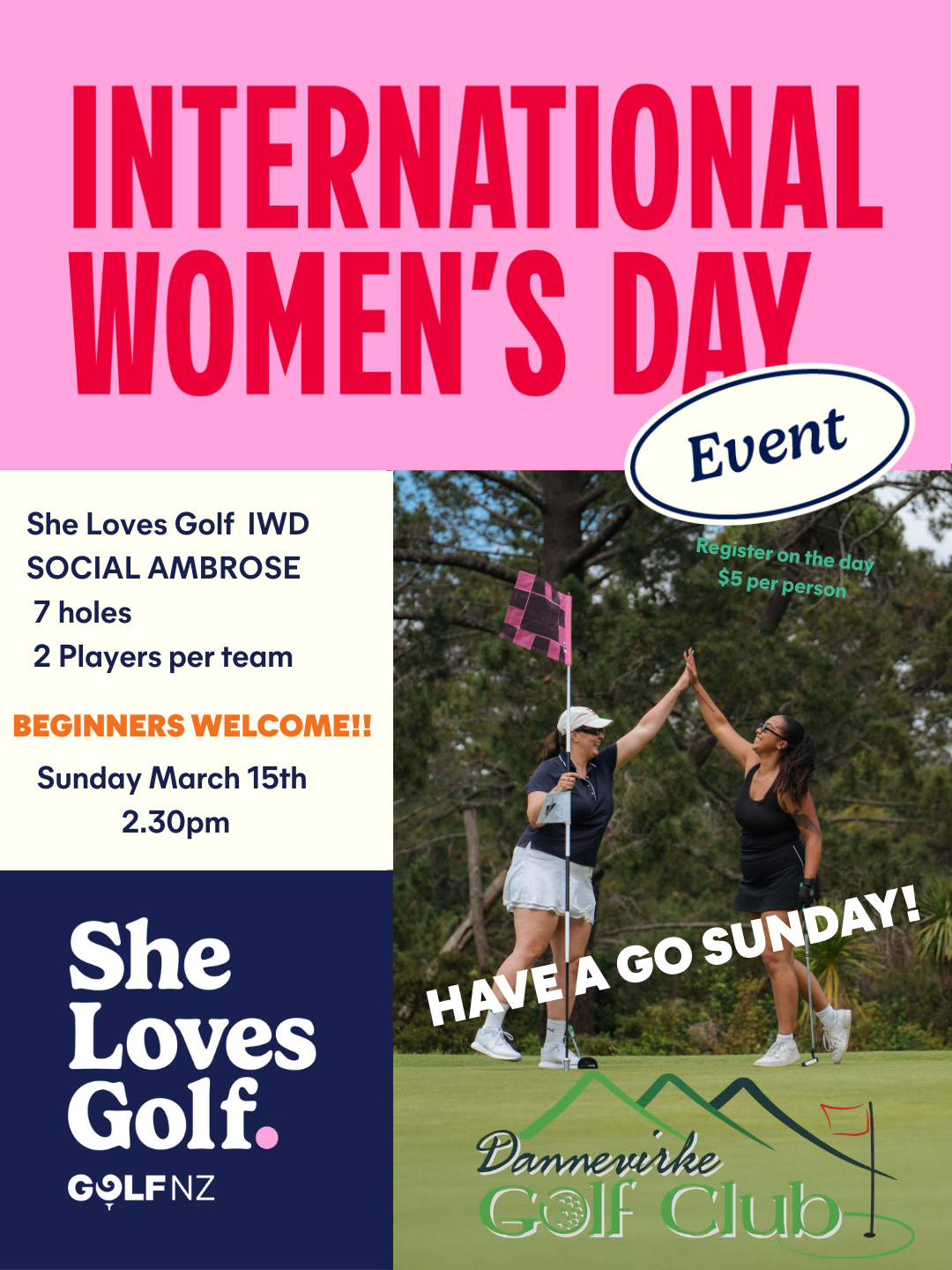 Sun, March 15th; (Reminder) This one is for the ladies!! Come and have a go! Bring a friend, or we'll find you a new one to play with.  Make some "me" time and celebrate International Women's Day at Dannevirke Golf Club - come down and have some fun and laughs, followed by a drink or two after   SOCIAL AMBROSE. 7 HOLES, 2 players per team. Sunday, March 15th, 2.30 pm. Register on the day, $5 per person. Thank you, Wendy Stratford